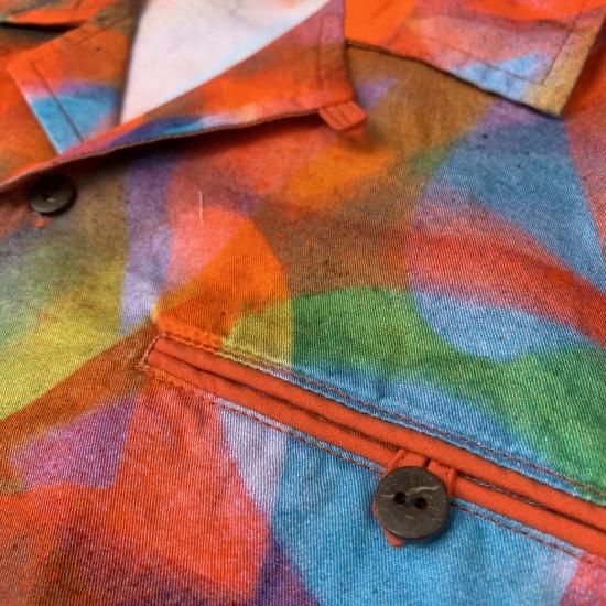 パッと目に飛び込む鮮やかなパターン柄シャツ。